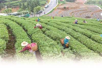 重慶市綦江區(qū)立足綠色生態(tài)資源稟賦,將茶產(chǎn)業(yè)打造成助力鄉(xiāng)村振興的主導(dǎo)產(chǎn)業(yè),讓“綠葉子”成為“金葉子”。圖為該區(qū)石角鎮(zhèn)新農(nóng)村村民在茶園內(nèi)采摘鮮茶葉。新華社發(fā)