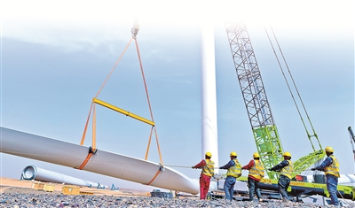 甘肅省高臺(tái)縣境內(nèi)有戈壁荒漠2000多平方公里,近年來憑借風(fēng)光資源優(yōu)勢(shì),發(fā)力新能源產(chǎn)業(yè)賽道。圖為該縣某新能源風(fēng)力發(fā)電項(xiàng)目建設(shè)現(xiàn)場(chǎng),工作人員正在安裝風(fēng)力發(fā)電機(jī)。新華社發(fā)