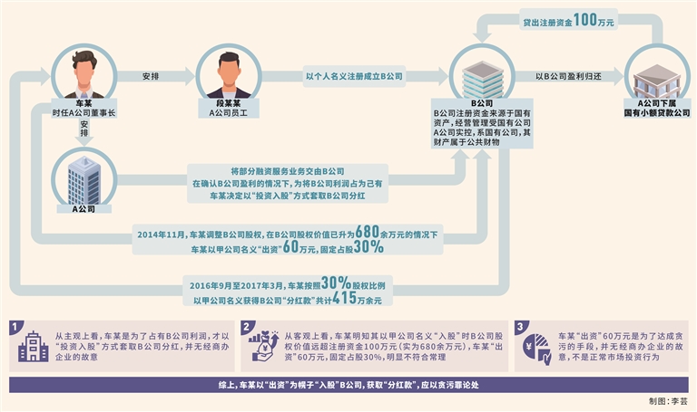 2013年下半年,A公司資產(chǎn)管理部開始承接N市J區(qū)高新園區(qū)的融資服務業(yè)務(政府平臺公司通過此業(yè)務融資,由國有單位信用背書),以A公司名義簽訂融資服務合同、開展業(yè)務,所得收益歸A公司。2014年,車某利用職權(quán)安排A公司相關(guān)部門將融資服務合同中的A公司變更為B公司,融資服務業(yè)務所得收益歸B公司。其明知該業(yè)務利潤高、無風險,在確認B公司盈利的情況下,為將B公司利潤占為己有,車某決定利用職務便利,以“投資入股”方式,套取B公司分紅。2014年11月,車某決定調(diào)整B公司股權(quán),在B公司引入“社會資本”,在B公司當時實際股權(quán)價值已升為680余萬元的情況下,車某以甲公司(私企,非車某實際控制)名義“出資”60萬元,固定占股30%;A公司出資40萬元,持股比例20%;段某某持股比例降為50%。