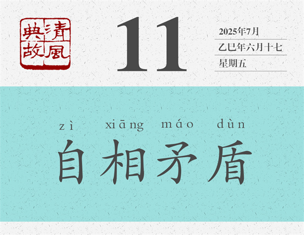“自相矛盾”的本義是,不管是自己的矛刺穿了自己的盾,還是自己的盾無(wú)法被自己的矛刺穿,都會(huì)陷入不能自圓其說(shuō)的難堪境地。后人則以“自相矛盾”為典,比喻一個(gè)人前面說(shuō)的和后面說(shuō)的、前面做的和后面做的相互抵觸,或者自己所說(shuō)與所做、自己所為與所述互相沖突。也指同一機(jī)關(guān)、同一機(jī)構(gòu)中各個(gè)部門(mén)、各個(gè)成員之間說(shuō)法不統(tǒng)一,行為不一致。宋人王觀國(guó)《學(xué)林·言行》:“圣賢言行,要當(dāng)顧踐,毋使自相矛盾。”