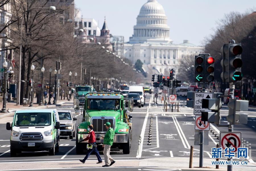 3月10日,在美國首都華盛頓,人們經(jīng)過國會大廈附近的一處路口。新華社記者劉杰攝