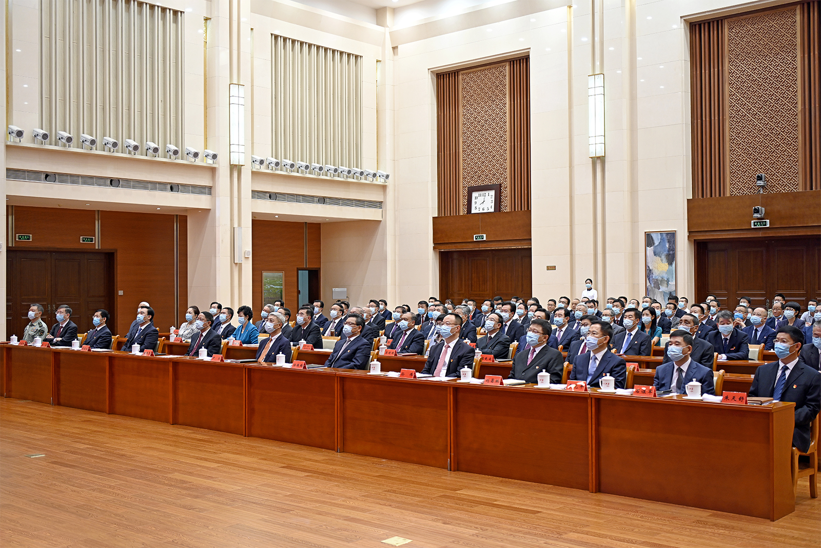 7時(shí)53分許,在歡快的樂曲聲中,習(xí)近平等黨和國(guó)家領(lǐng)導(dǎo)人來到天安門城樓主席臺(tái),會(huì)場(chǎng)爆發(fā)出熱烈的掌聲。8時(shí)整,慶祝大會(huì)開始,中國(guó)人民解放軍聯(lián)合軍樂團(tuán)奏響雄壯的《義勇軍進(jìn)行曲》,尹弘、任振鶴等全體起立,隨北京現(xiàn)場(chǎng)一起高唱中華人民共和國(guó)國(guó)歌,目視大屏幕里鮮艷奪目的五星紅旗冉冉升起,在天安門廣場(chǎng)上空迎風(fēng)飄揚(yáng)。在熱烈的掌聲中,習(xí)近平總書記發(fā)表重要講話,大家認(rèn)真聆聽、專心筆記,第一時(shí)間深刻學(xué)習(xí)領(lǐng)會(huì),不時(shí)報(bào)以熱烈的掌聲。