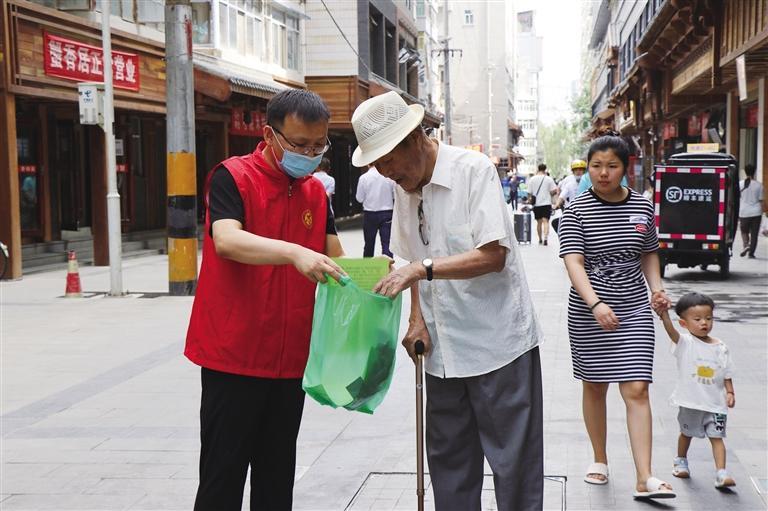 志愿者發(fā)放垃圾分類宣傳資料 王瀟旋 攝