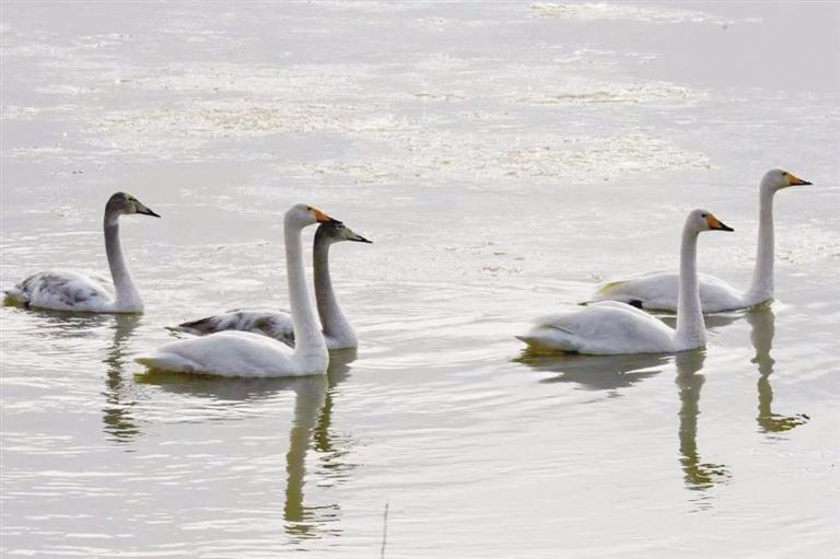 中國甘肅網(wǎng)1月7日訊 據(jù)蘭州日報報道(記者 董永前 攝)最近幾天,西固區(qū)達川鎮(zhèn)三江口水域,成群天鵝在這里“落戶安家”,成為當?shù)匾患恍〉男侣劊簧偈忻窈陀慰颓皝碛^賞。