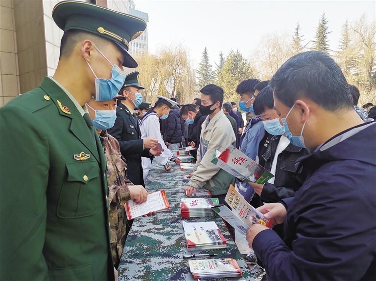 圖為大學生領(lǐng)取征兵宣傳資料。