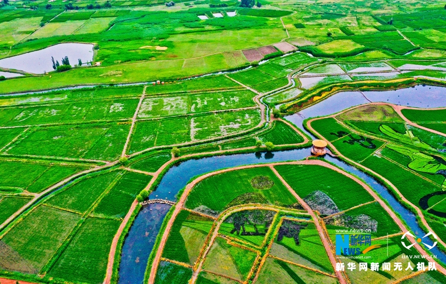 這是7月13日在甘肅省張掖市甘州區(qū)烏江鎮(zhèn)航拍的稻田景觀(guān)。新華網(wǎng)發(fā) (王將 攝)
