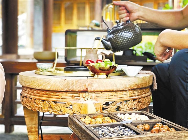 晚飯后是上座活躍期,一撥撥客人或隨意落座在古色古香的四合院長(zhǎng)廊間,或穿堂入室端坐里間,聊天打趣侃侃而談,“搗”茶品茗各取所好,一天的疲乏與負(fù)累不知不覺間隨著那一刻輕溫慢煮的好時(shí)光,消散殆盡。