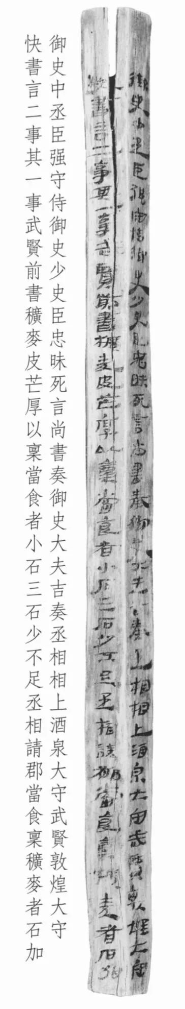 此簡為漢宣帝回復酒泉太守“辛武賢”和敦煌太守“快”奏疏的恩準詔書,簡文記載的是皇帝詔書中對兩太守奏疏內容的復述。從簡文內容看,酒泉太守辛武賢和敦煌太守快給朝廷的奏疏主要涉及兩件事情:一是辛武賢認為作為糧草的穬麥因皮厚芒長,如按規(guī)定每人發(fā)放小石三石,會造成實際數(shù)量的不足,所以他請求皇帝每石加發(fā)若干。另一件事顯然是敦煌太守快的上書,但文字未能容納于此簡,故不得而知。