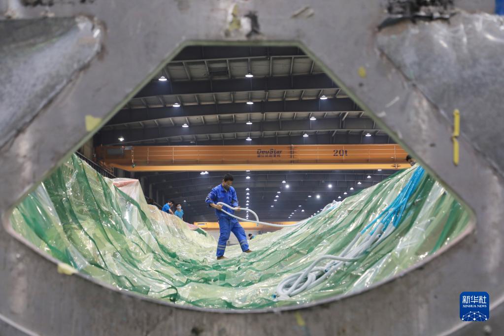 2月17日,在酒泉經(jīng)濟技術(shù)開發(fā)區(qū)的一家風(fēng)電葉片制造企業(yè),工人在風(fēng)機葉片生產(chǎn)線為葉片灌注做準(zhǔn)備。