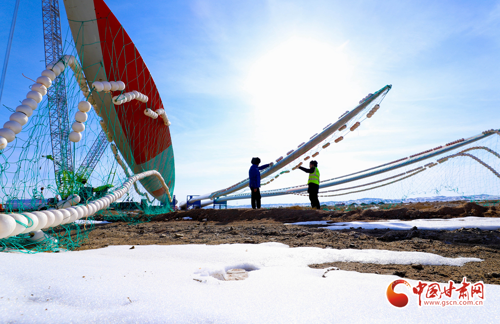 2月21日,張掖市臨澤縣板橋北灘20萬千瓦光伏發(fā)電項(xiàng)目建設(shè)現(xiàn)場(chǎng),工作人員正在進(jìn)行發(fā)電前的設(shè)備調(diào)試。