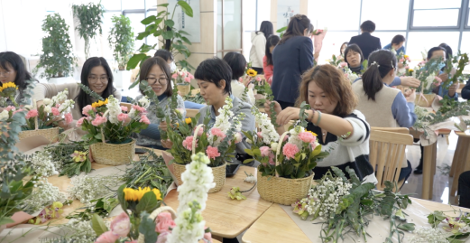 繁花似錦報(bào)春來(lái),天姿國(guó)色抒情懷?;顒?dòng)現(xiàn)場(chǎng)花香四溢、芬芳溫馨,充滿著春天般的氣息,大家手捧鮮花,在花藝?yán)蠋煹闹v解下,開(kāi)始學(xué)習(xí)各種鮮花所蘊(yùn)含的花語(yǔ)祝福和選花、裁剪、搭配、造型及養(yǎng)護(hù)等藝術(shù)插花技巧。隨后,女工們將原本普普通通的月季、康乃馨、蝴蝶蘭、滿天星、向日葵等多種花材修剪整枝,根據(jù)不同的色彩和形狀有層次地搭配在一起。通過(guò)精心構(gòu)思造型、發(fā)揮創(chuàng)意想象,有的注重意境創(chuàng)設(shè)追求,有的突出枝情花韻之趣,有的抒展自然樸實(shí)風(fēng)格……在細(xì)致地修飾和精心地創(chuàng)作下,一枝花、一棵草都變得詩(shī)情畫(huà)意和清新怡人,節(jié)日的喜慶氣氛瞬間升騰。