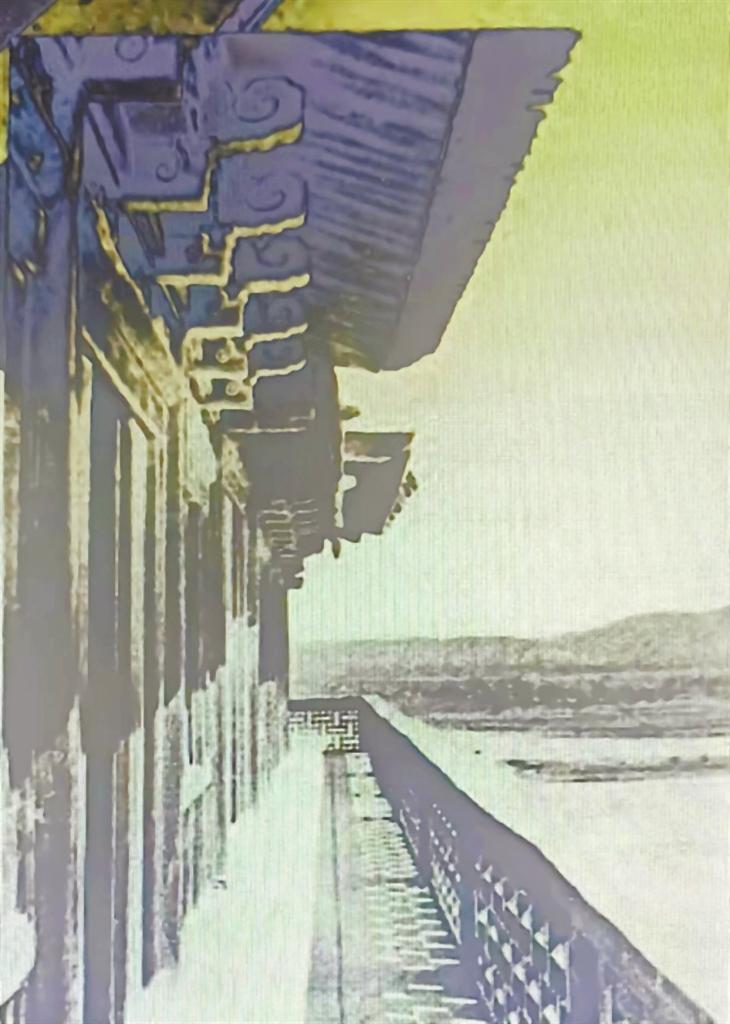 林競(jìng)《西北叢編》一書(shū)載,其與蘭州友人于1919年2月7日出游雷壇河臥橋,“橋長(zhǎng)十余丈,其形如弓,橋上蓋屋,足蔽風(fēng)雨,五彩繪畫,兩端有坊,東曰‘空中鰲背’,西曰‘天上慈航’,橋底無(wú)墩,自遠(yuǎn)望之,宛如臥龍。”林競(jìng)還詳細(xì)記錄了蘭州雷壇河臥橋的建造方法,并對(duì)之科學(xué)性表示肯定:“聞此橋原來(lái)有墩,因某年山洪爆發(fā),被其沖毀,自是始改今式。其法,先將兩岸之橋基筑好,以數(shù)丈長(zhǎng)之巨木直列成排,復(fù)以橫木連之,木材之?dāng)?shù),依橋之寬狹而定,其前端伸出橋中約二三尺,其后端即以巨石壓之,如是疊架不已,每加一層,即前端伸過(guò)下層數(shù)尺,如倒掛之階梯然。而層與層之間,復(fù)聯(lián)以鐵環(huán)及釘木,迨兩岸相距不遠(yuǎn)時(shí),即以巨木渡之。此種構(gòu)造,在西北往往因河水湍急,不能筑墩,或游牧之民,不知在河中建筑橋墩之法而始用之。然亦甚合於力學(xué)原理,未可忽視也。”
