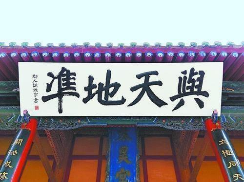 “與天地準”出自《周易·系辭傳上》。原句為:“易與天地準,故能彌綸天地之道”。準,意為等、等同(此依高亨解)。有學者或將“準”解釋為標準,或解釋為法則等,唯高解最貼原意;彌,意為遍,普遍;綸,意為絡,包絡。彌綸,意即普遍包絡。此句可釋為:《易》所闡述的“性命之理”是與天地運行的自然法則等同的,所以它能夠包容天地之間萬事萬物的運行規(guī)律。匾文“與天地準”,是贊頌伏羲首創(chuàng)的八卦,高度概括了天地萬物運行之規(guī)律,為人們認識世界、改造世界提供了思想武器。