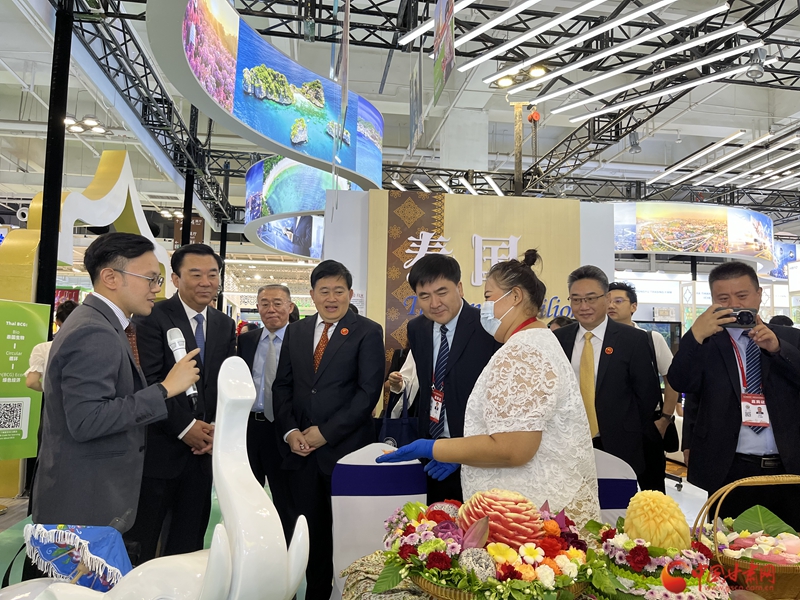 泰國國家館展覽面積300平方米,由泰國駐西安總領事館牽頭組織參展,展區(qū)設計采用白金色為主色調(diào),簡潔明亮,富有泰國特色。主要展示泰國特色文化、企業(yè)和產(chǎn)品。展館整體劃分為接待區(qū)、洽談區(qū)、舞臺表演互動區(qū)、泰國雕刻體驗區(qū)、泰式按摩體驗區(qū)、模擬泰國旅游景點拍照區(qū)及產(chǎn)品展示區(qū)等,通過造型、多媒體、圖片及表演等形式,以Food 美食、Fighting 泰拳、Film 電影、Fashion 時尚和 Festival 節(jié)日等多元素,全面展示泰國文化的多元、包容、開放與創(chuàng)新的特點。參展企業(yè)共22家,主要展品涵蓋食品、化妝品、居家用品及保健按摩產(chǎn)品等。