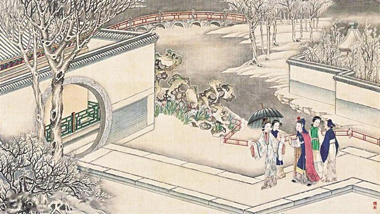 著名紅學(xué)家周汝昌曾評論清代孫溫《紅樓夢》繪本是“紅樓瑰寶”,其中一處細(xì)節(jié)就配得上這種評論。賈政攜寶玉和眾客游覽大觀園的繪制中,孫溫用了13幅畫并以焦點(diǎn)游移的手法,一路將賈政等人的路線詳細(xì)描繪出來,跟著畫面而走,觀者可以看到瀟湘館、蘅蕪院、沁芳亭、沁芳橋等大觀園景觀,令人嘆為觀止。