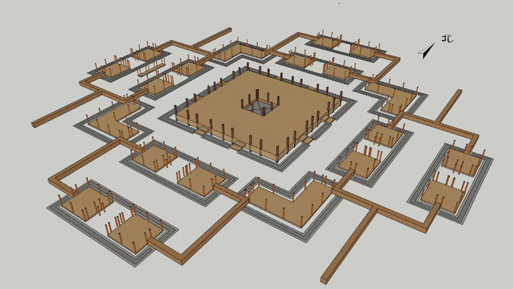 四角坪遺址考古隊(duì)領(lǐng)隊(duì)、甘肅省文物考古研究所副研究館員侯紅偉介紹,四角坪遺址已發(fā)掘部分主要由中部大型方形夯土臺基、四周的附屬建筑以及四角曲尺形附屬建筑組成,整個(gè)建筑群層級分明、秩序井然。整體呈現(xiàn)出以中部大型夯土臺基為中心的對稱格局。考古人員通過解剖土層發(fā)現(xiàn),整個(gè)臺基由34層夯土夯筑而成,每層厚7至8厘米。
