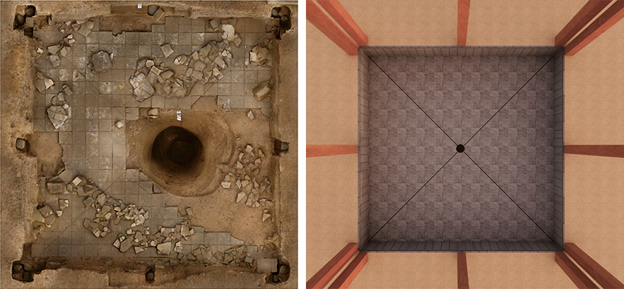 中部夯土臺基的中心發(fā)現(xiàn)一處神秘的半地穴空間。它的地面鋪素磚,四壁貼壁磚并用鐵釘固定,各磚縫之間還用特殊材料專門做了“美縫”處理。種種跡象表明此處可能是一個(gè)“水池”,但中間被一口豎井狀大坑破壞。