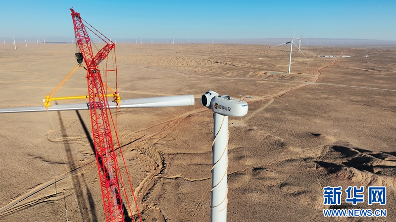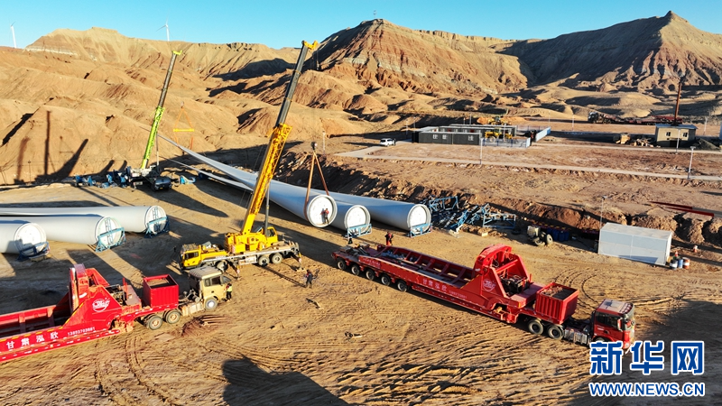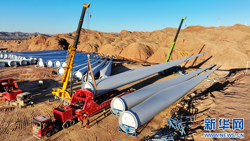隆冬季節(jié),在甘肅省張掖市甘州區(qū)平山湖風電基地國家電投10萬千瓦風電項目建設工地,工人正在進行風機葉片吊裝作業(yè)。