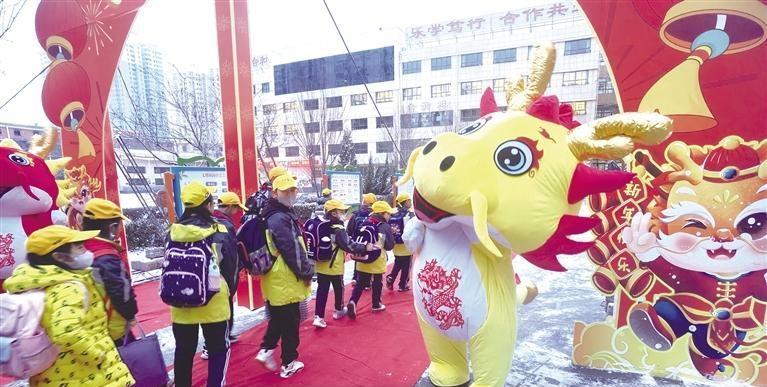 當(dāng)日上午7時許,記者在蘭州市東郊學(xué)校看到,校門內(nèi)兩邊擺放著兩條由數(shù)百個氣球組成的長龍。高年級段和低年級段的學(xué)生要穿越寫著“龍騰虎躍,前程似錦”的龍門,方可進(jìn)入教室。同時,兩邊的老師,給每一位到校的學(xué)生發(fā)放小禮物。記者注意到,每個孩子都領(lǐng)到了一個小盲盒,里面裝著不同的文具。孩子們高興地?fù)]舞著手中的盲盒,展示新春的快樂。