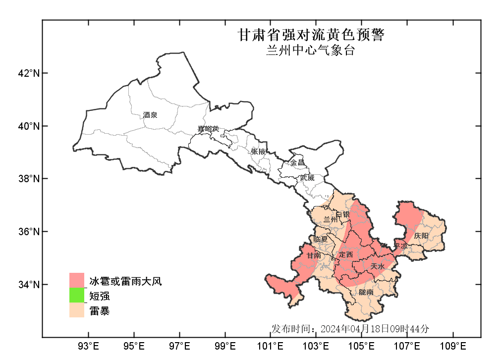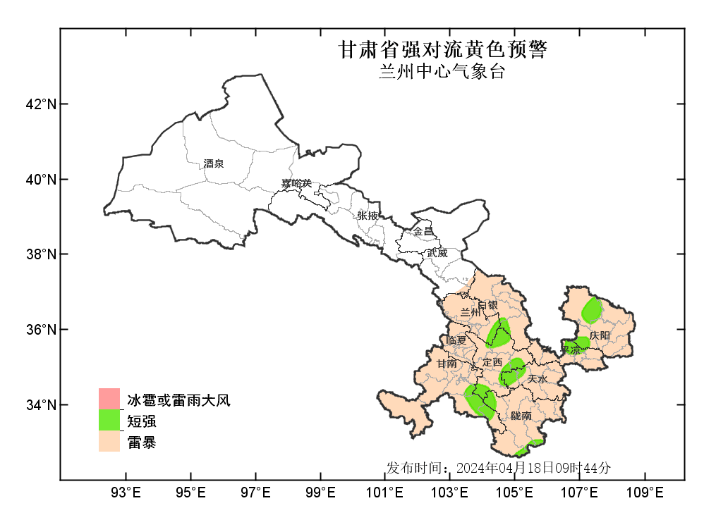 中國甘肅網(wǎng)4月18日訊(西北角·中國甘肅網(wǎng)記者 沈文剛)4月18日9時44分,蘭州中心氣象臺發(fā)布強對流黃色預(yù)警:預(yù)計今天白天到夜間,武威以東大部分地方有雷暴;其中,白銀、定西、甘南、天水等市州部分地方及蘭州、隴南、平?jīng)觥c陽等市局部地方有雷雨大風(fēng)或冰雹;甘南、隴南、定西、天水、白銀、蘭州、平?jīng)?、慶陽等州市局部地方有短時強降水,最大小時雨強為20-30毫米。