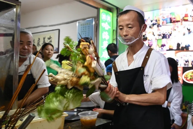 工作人員在天水市名優(yōu)小吃城內制作麻辣燙。新華社記者呂帥攝