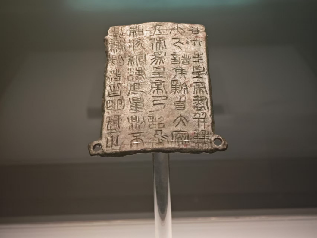 “鎮(zhèn)原縣博物館的鎮(zhèn)館之寶是秦二十六年銅詔版,1976年 4月 1日被鎮(zhèn)原縣城關(guān)鎮(zhèn)富坪村建宅取土的農(nóng)民發(fā)現(xiàn)并上交。在1996年 9月,國(guó)家文物局鑒定專(zhuān)家組定為國(guó)家一級(jí)文物。這塊銅詔版上有文字5 行,共40字,字跡清晰,線(xiàn)條纖細(xì),字體為小篆。在用筆結(jié)構(gòu)上既有秦代小篆規(guī)矩整飭的風(fēng)范,又保留著大篆文字的某些特點(diǎn)。”鎮(zhèn)遠(yuǎn)縣博物館講解員介紹道。