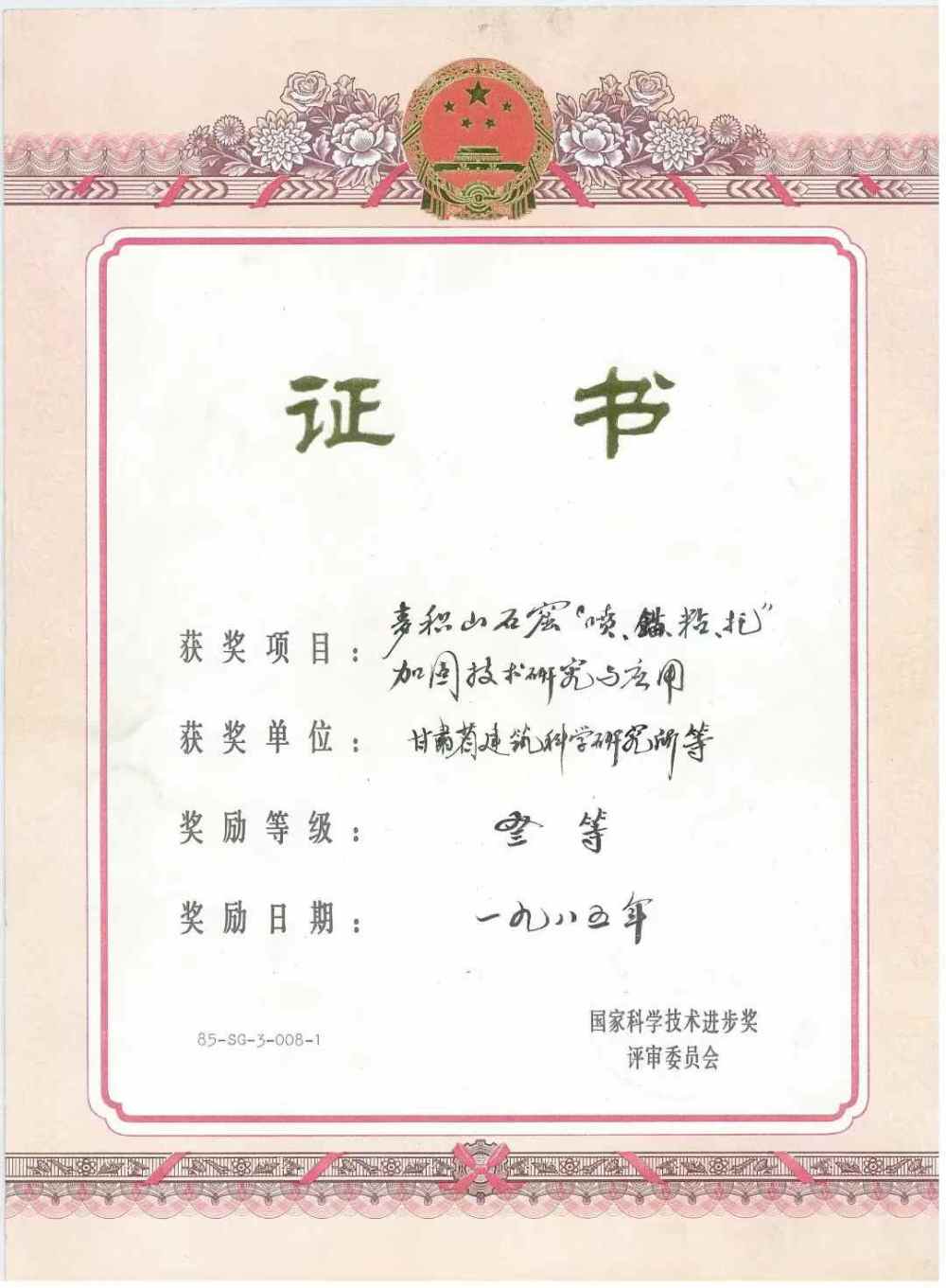 鑒定認為,麥積山石窟維修加固工程在總結了國內(nèi)巖體加固經(jīng)驗的基礎上,結合麥積山石窟巖體的特點和不改變原狀的原則,成功地采用了“噴、錨、粘、托”綜合加固技術,為保護石窟文物開創(chuàng)了一條新的途徑。1985年,甘肅建科院榮獲國家科技進步獎三等獎、甘肅科技成果獎二等獎。