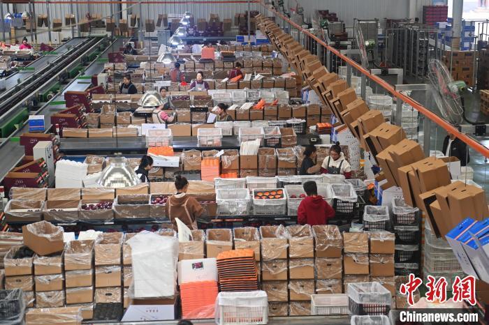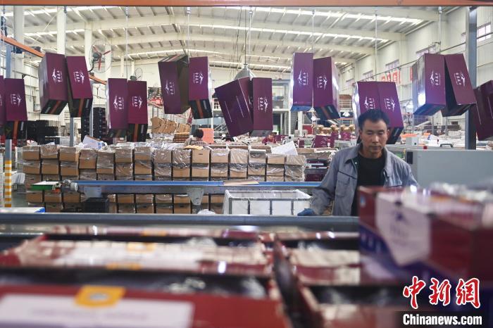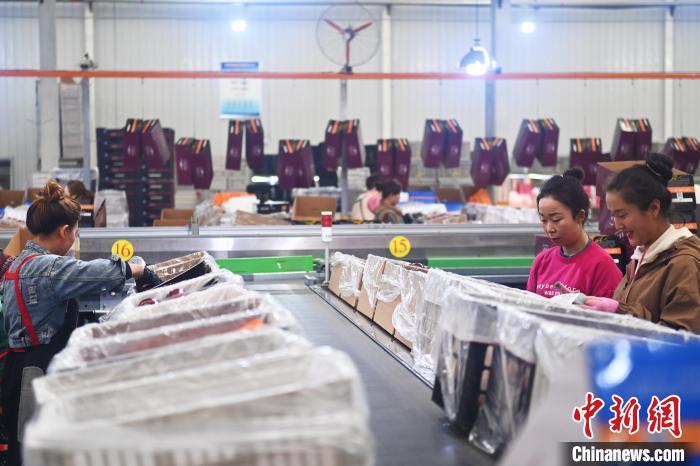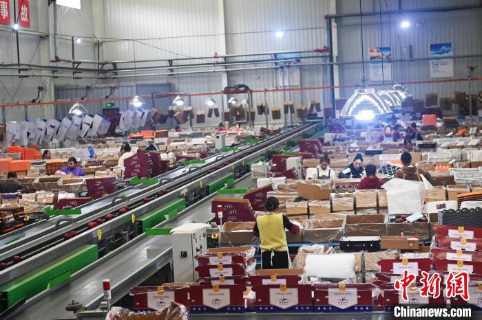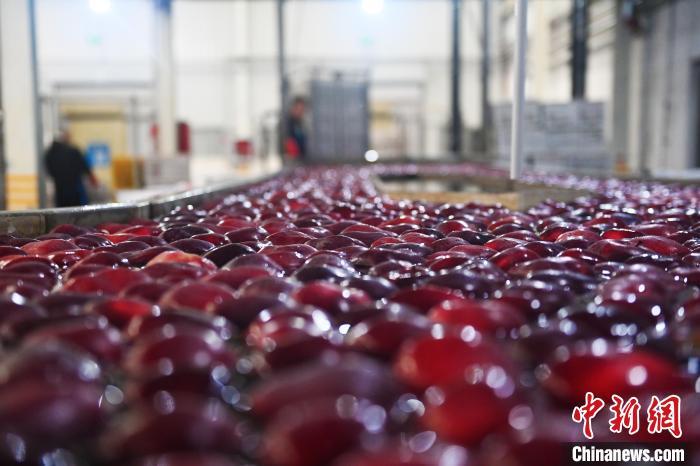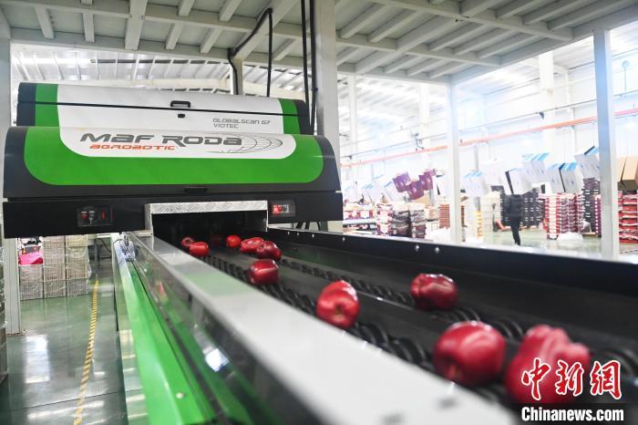 10月21日,在甘肅省天水市秦安縣雪原果品有限公司加工車間,蘋果自動化分揀線上工作人員進行分揀工作。該生產(chǎn)線每天能處理30噸蘋果,蘋果經(jīng)過設備水洗、烘干、稱重等環(huán)節(jié),進入不同等次的包裝線,工人們再對每顆蘋果進行復檢、貼標,分裝在不同規(guī)格的包裝箱中。甘肅秦安蘋果總面積61.37萬畝,產(chǎn)量86.8萬噸,產(chǎn)值55.6億元人民幣,先后從國內(nèi)科研院所引進青砧、M26、ZH5等抗重茬蘋果矮化砧木6個,配合國家蘋果產(chǎn)業(yè)技術體系,引進長富2號、煙富6號、煙富8號、瑞香紅等蘋果新品種12個。中新社記者李亞龍攝