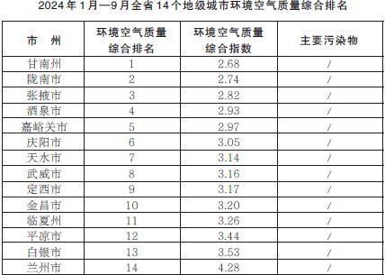 2024年1月—9月,全省14個(gè)地級(jí)城市環(huán)境空氣質(zhì)量綜合排名由高到低分別為:甘南州、隴南市、張掖市、酒泉市、嘉峪關(guān)市、慶陽市、天水市、武威市、定西市、金昌市、臨夏州、平?jīng)鍪?、白銀市、蘭州市。
