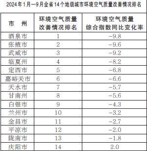 2024年1月—9月,全省14個(gè)地級(jí)城市環(huán)境空氣質(zhì)量改善情況排名由好到差分別為:酒泉市、張掖市、武威市、臨夏州、定西市、嘉峪關(guān)市、天水市、甘南州、白銀市、蘭州市、金昌市、平?jīng)鍪?、隴南市、慶陽市。