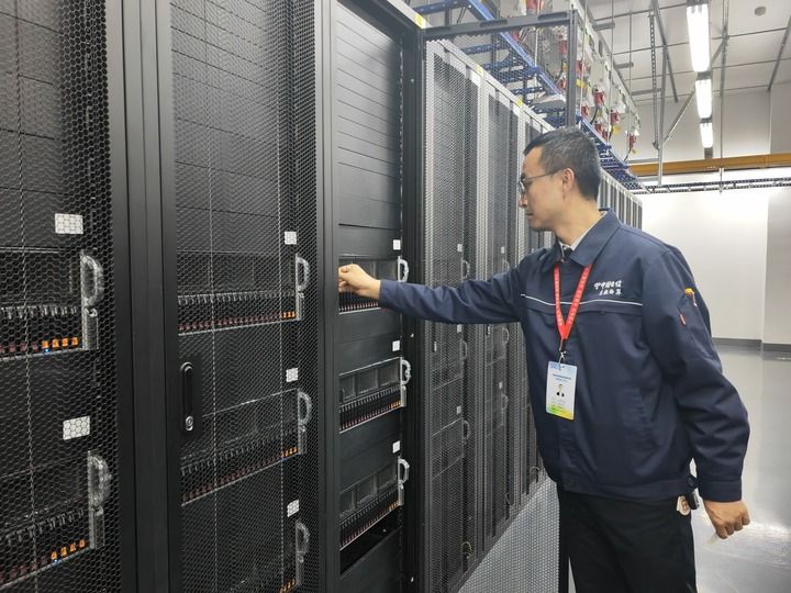 國家數(shù)據(jù)中心集群(甘肅·慶陽)“東數(shù)西算”產(chǎn)業(yè)園區(qū),工作人員在機柜旁作業(yè)(2024年10月28日攝)。新華社記者 梁軍 攝