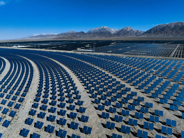 青海省海西蒙古族藏族自治州德令哈市光伏(光熱)產(chǎn)業(yè)園的光熱電站(2024年4月23日攝,無人機照片)。新華社記者 張龍 攝