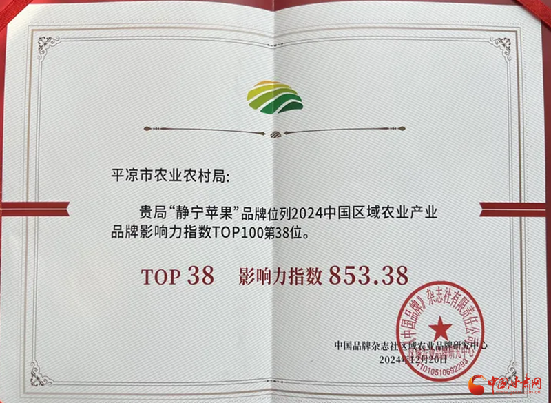 中國甘肅網(wǎng)12月25日訊(西北角·中國甘肅網(wǎng)記者 孫珩力 通訊員 胡繼萬)近日,由《中國品牌》雜志、中國品牌網(wǎng)主辦的2024區(qū)域農(nóng)業(yè)品牌年度盛典在浙江金華舉行。會上,“靜寧蘋果”品牌榮登2024中國區(qū)域農(nóng)業(yè)產(chǎn)業(yè)品牌影響力指數(shù)百強榜。
