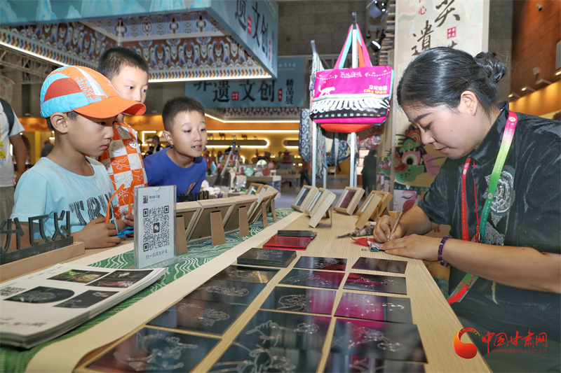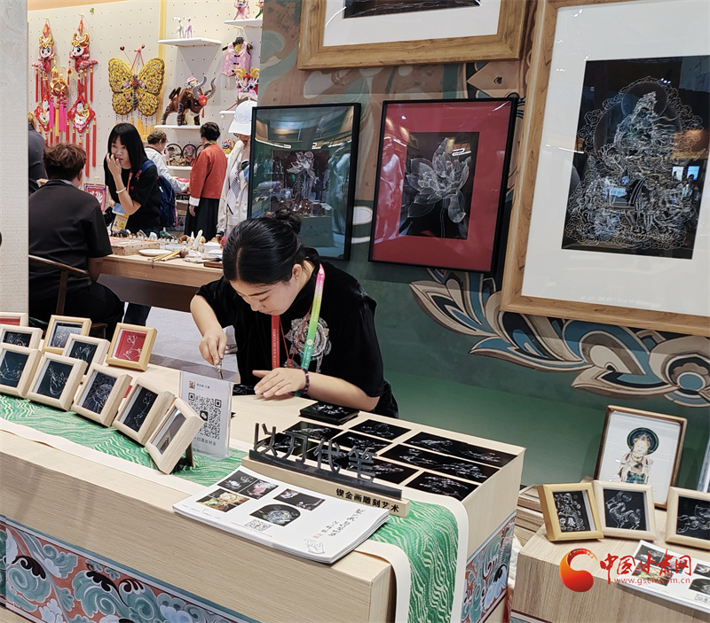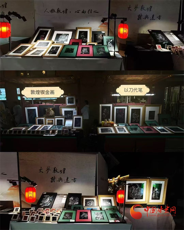 第八屆敦煌文博會非遺文創(chuàng)展區(qū),非遺藝人王婕正在展示鍥金畫技藝。通俗來說就是在金屬板上刻畫,每一個(gè)線條都要用刻刀在金屬板材上留下印痕。