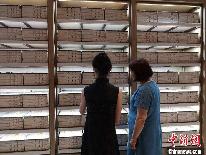 讀者站在書(shū)架前仔細(xì)觀摩線裝《四庫(kù)全書(shū)》?!⊥τ辍z