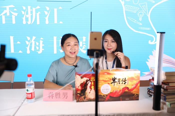 作家蔣勝男在上海書(shū)展與網(wǎng)絡(luò)達(dá)人直播中。浙江文藝出版社供圖