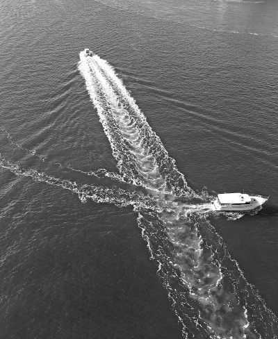 在這張照片里你看見了,天氣晴朗,海水蔚藍(lán),兩船交叉駛過(guò),畫出如此美麗的浪花。這兩艘游船并不是匆匆過(guò)客,而是相約作一次表演,海域內(nèi)洋溢著歡樂(lè)的氣氛。