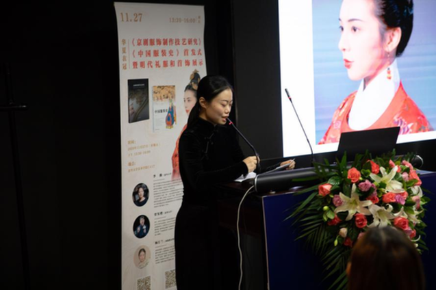 風(fēng)陵渡金銀器復(fù)原工作室首席設(shè)計師楊汀蘭向大家介紹了明代禮服以及明代經(jīng)典首飾的制作工藝,并現(xiàn)場通過模特展示了明代首飾的佩戴方法和整體造型。最后,與會專家還圍繞兩本新書展開了學(xué)術(shù)研討和交流,分別從不同角度對這兩本書進(jìn)行了探討。