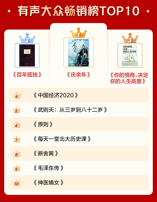 隨著大IP改編影視劇的熱度逐年升高,影視劇原著小說(shuō)也越來(lái)越成為數(shù)字閱讀中最暢銷的書籍類型。其中,《慶余年》隨著電視劇的火爆和《慶余年2》原班人馬即將開(kāi)拍帶來(lái)的熱議流量,其原著小說(shuō)入圍電子書暢銷榜TOP10和有聲書暢銷榜TOP10;改編為《沉默的真相》的紫金陳原著小說(shuō)《長(zhǎng)夜難明》則位列電子書暢銷榜第6名。