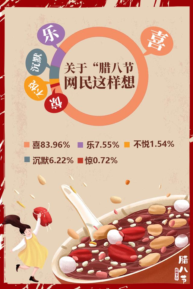 雖然今年多地的臘八節(jié)活動因疫情而取消,但是人們對于團圓、祥和、富裕、康寧、平安的期盼從未改變。有關(guān)“臘八”的網(wǎng)民情緒分布中,“喜”占83.96%,“樂”占7.55%。總體來說,開心喜悅的情緒占到了九成以上。