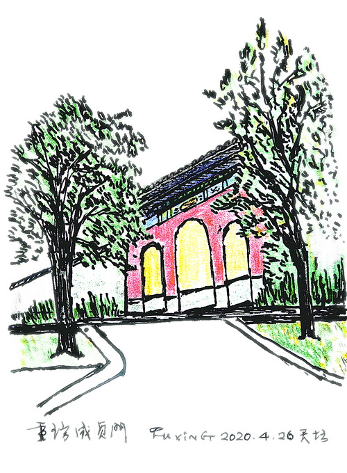 書(shū)已寫(xiě)罷,小寒節(jié)氣過(guò)后,我又多次去天壇,不為寫(xiě)作,只是習(xí)慣,仿佛腳步慣性,去天壇轉(zhuǎn)轉(zhuǎn),就會(huì)感覺(jué)充實(shí)一些。2020年1月20日正值大寒節(jié)氣,那天下午,我從圜丘到成貞門西北側(cè),那里并排有兩把座椅,我坐在座椅上畫(huà)成貞門。春節(jié)將近,除了工人在懸掛紅燈籠、安裝慶祝春節(jié)的展牌,天壇里的游人并不多。我和很多游人一樣,不知道,或者說(shuō)不敏感,一場(chǎng)疫情正如餓虎撲食那樣向我們迫近。