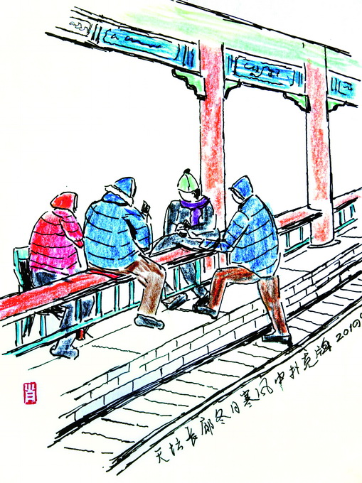 童年時(shí),我家離天壇很近,即便是現(xiàn)在的住所,離天壇也不算遠(yuǎn),地利之便,使我和天壇有種天生的緣分。這種緣分不是一見(jiàn)鐘情,而像長(zhǎng)時(shí)間接觸磨出來(lái)的老繭,結(jié)實(shí)且持久。幾十年來(lái),天壇是我最常去的公園,最近幾年迷上畫(huà)畫(huà),更要去那里畫(huà)速寫(xiě)。由于畫(huà)畫(huà),身邊總會(huì)站著幾個(gè)看畫(huà)的人,無(wú)論褒貶,一定得聊上幾句。以前有人看我畫(huà)畫(huà),我老覺(jué)得不自在,后來(lái)臉皮不僅變厚了,心里還冒出個(gè)念頭:如果天天到這里畫(huà)畫(huà),可以接觸到好多人,隨手記下各色人等的人生百態(tài),這不是挺有意思的嗎?