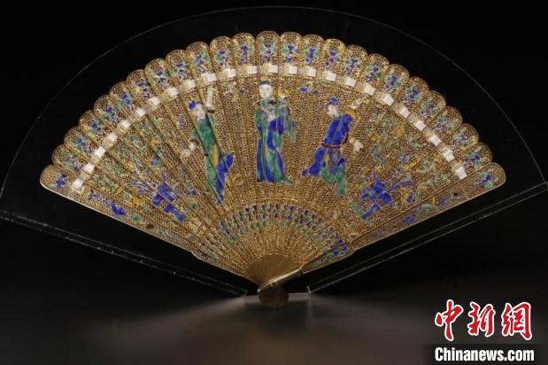 館藏的銀累絲鎏金燒藍戲曲人物故事圖折扇。廣東省博物館 供圖