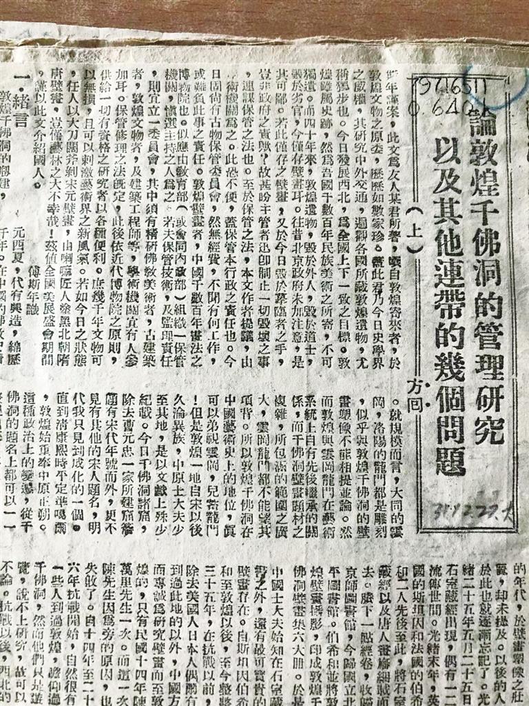向達先生曾先后兩次考察敦煌,第一次是在1942年4月,中央研究院組織西北史地考察團,其中的歷史考古組由中央研究院歷史語言研究所、中央博物院與北京大學(xué)聯(lián)合組成,向達代表北大并擔(dān)任歷史考古組主任。在這次考察中,他在給友人、南京博物院院長曾昭燏的信件中講述了他第一次看到敦煌莫高窟時的激動心情,同時對于莫高窟受到自然和人為的毀壞而感到痛心。他用三天的時間寫成了一萬多字、此后對敦煌學(xué)有重大影響的《論敦煌千佛洞的管理研究以及其他連帶的幾個問題》,署名“方回”寄給了傅斯年,后經(jīng)傅斯年推薦,在重慶的《大公報》連載發(fā)表,文中提出將千佛洞收歸國有,由學(xué)術(shù)機構(gòu)進行管理,開展研究工作等建議。此文發(fā)表,一石激起千層浪,直接推動國立敦煌藝術(shù)研究所于1944年成立。研究所成立后,常書鴻任所長。這也開啟了“敦煌學(xué)”長流不息的淵源。樊錦詩后來也撰文稱:“他(向達)文章中提出的關(guān)于保護和管理的具體建議,被后來成立的敦煌藝術(shù)研究所采納,成為敦煌石窟保護和管理的參照。向達提出的‘不可輕易剝離壁畫’的主張,也是敦煌研究院幾十年來在壁畫保護和管理中一直恪守的紀(jì)律和原則。”