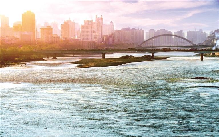 河分南北,勢(shì)接?xùn)|西。舒寧陜之博帶廣袖,帶青藏之峨冠雪衣。山逶迤而續(xù)祁連,水澎湃而瀉右?guī)住R洮湟之迤邐,有容乃大;與華夏之康莊,唇齒相依??睾游髯呃?,自古而始;俯渭涇秦川,由朝至夕。綴葫蘆狀岸渚坪灘,幾多古渡;依膏腴處坡谷盆地,即就蕃息。筑虹蜺經(jīng)百年,鐵橋第一;盤(pán)游龍於今朝,立交數(shù)十。去病鞭地,五泉山勝于秀逸;永誠(chéng)建院,白塔寺高于云齊。指點(diǎn)九州,大禹登九州之臺(tái);漂流黃河,洋人恐招手之磯。草覆馬銜而能牧,林茂興隆云可棲。繞營(yíng)盤(pán)高嶺排五,峙雄關(guān)沿河有七。留千古名,白馬浪細(xì)聽(tīng)湍流不息;鎖萬(wàn)代鑰,金城關(guān)只留站牌不奇。雷壇留碑,金天觀曾殿宇壯麗;華林無(wú)寺,節(jié)能燈照幽路石基。湍流黃河,九曲回腸依然東去;水轉(zhuǎn)輪盤(pán),十方高地亦滿紛披。