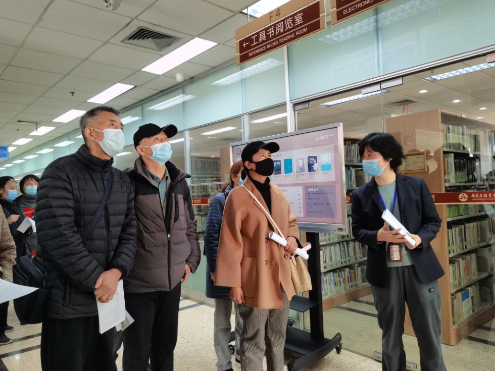 圖書館里的志愿者老師帶領(lǐng)老人游覽圖書館,并用英語(yǔ)進(jìn)行講解。新華社記者汪海月攝