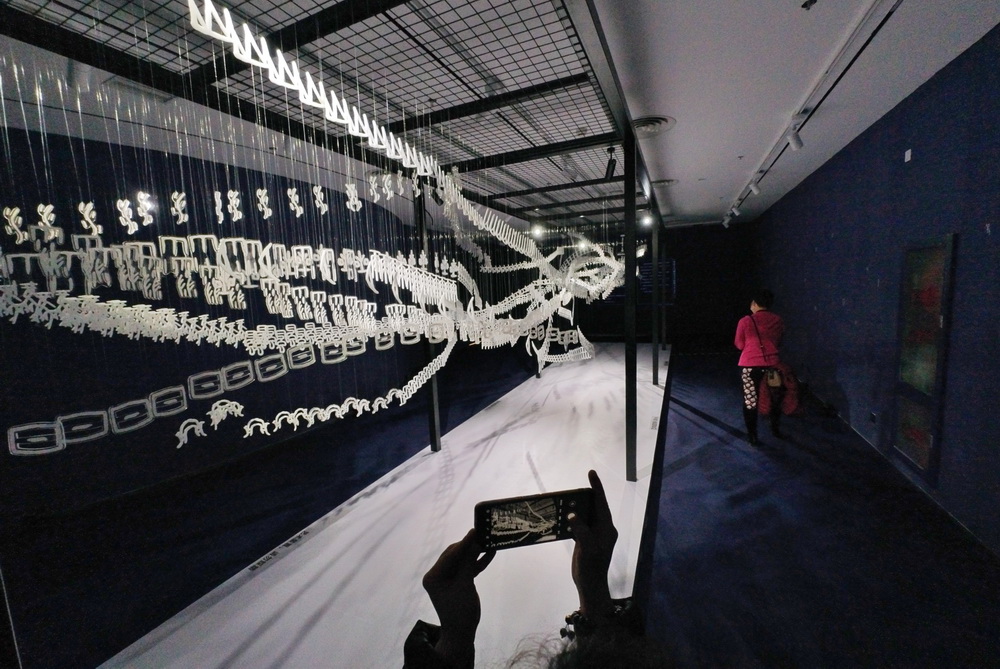 2022年1月3日,天津國(guó)圖·津?yàn)澄膭?chuàng)空間舉辦,甲骨文創(chuàng)意展,一名參觀者用手機(jī)拍攝甲骨文懸空雕塑。 中新社記者 佟郁 攝