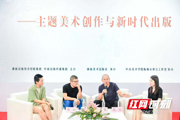 活動現(xiàn)場,康劍飛、武將、《少年毛澤東》項目藝術指導譚坦、《少年毛澤東》項目執(zhí)行張瑄等四位嘉賓,圍繞主題美術創(chuàng)作與主題出版、插圖與繪本演變、版畫的發(fā)展與傳播特點等議題展開討論,并結合湖南美術出版社即將出版的《少年毛澤東》,分享了創(chuàng)作心得,還與現(xiàn)場的讀者進行了互動交流。