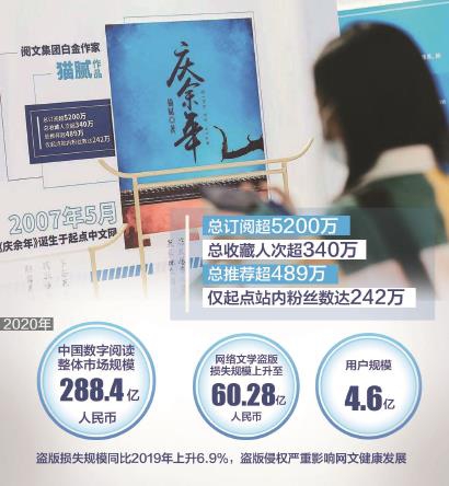 有數(shù)據(jù)顯示,2020年中國網(wǎng)絡(luò)文學(xué)市場規(guī)模為288.4億元,網(wǎng)絡(luò)文學(xué)通過IP全版權(quán)運(yùn)營間接或直接影響了動漫、音樂、影視、游戲等合計(jì)約2531億元的市場,對數(shù)字文化產(chǎn)業(yè)的影響范圍超過40%。但令人痛心的是,2020年中國網(wǎng)絡(luò)文學(xué)盜版損失規(guī)模達(dá)60.28億元,同比上升6.9%。