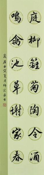 庭柳籬菊陶令酒,鳴禽池草謝家春。 釋文:庭前柳樹,籬邊菊花,陶淵明飲酒于此,怡然自得;池塘里長滿了春草,樹上的鳴鳥冬去春來,謝靈運因此寫出了這樣的千載名句。韓宗岳(滿族)
